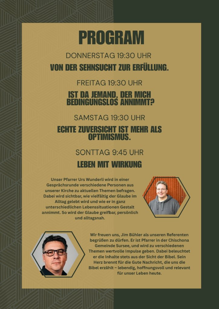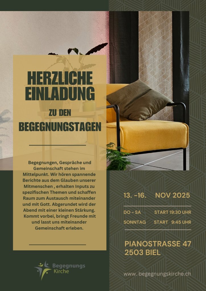 Begegnungen, Gespräche und Gemeinschaft stehen im Mittelpunkt. Wir hören spannende Berichte aus dem Glauben unserer Mitmenschen , erhalten Inputs zu spezifischen Themen und schaffen Raum zum Austausch miteinander und mit Gott. Abgerundet wird der Abend mit einer kleinen Stärkung.